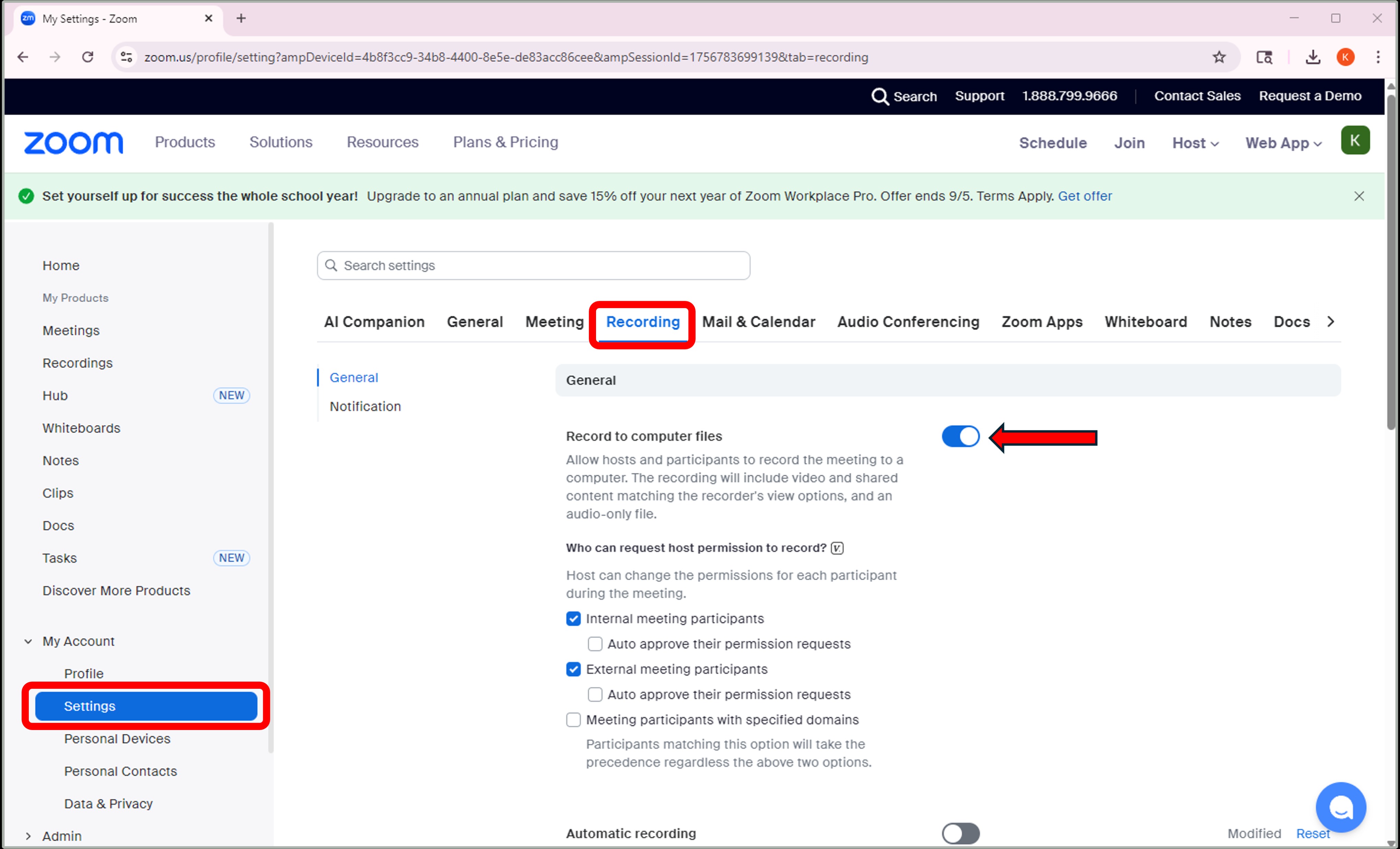 To enable computer recordings in Zoom, adjust your settings as follows: